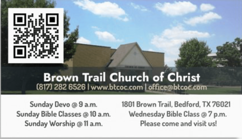 For information about the Brown Trail Church of Christ please visit the following website: http://www.btcoc.com | office@btcoc.com | (817) 282 6526